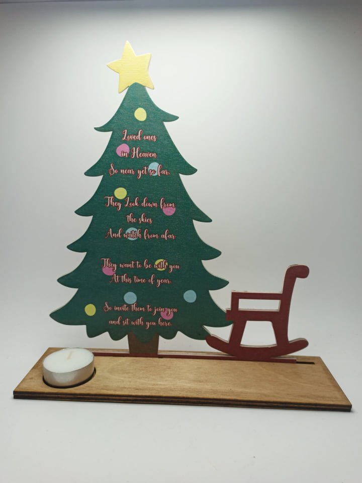 Christmas in Heaven. Wooden Christmas Tree and Chair with Candle holder and printed saying